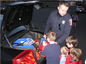 My dorośli wiemy, jak trudno przekazać jest dzieciom taką wiedzę. Jak wspaniałym wykładowcą był Pan Leszek, może świadczyć fakt, że przez ponad godzinę nasze pociechy zainteresowane jego prezentacją, siedziały wpatrzone i wsłuchane. Jedną z wielu atrakcji była „inspekcja” - cała gromadka wyszła na parking gdzie stał samochód policyjny i dokonała jego „oględzin”, czyli została poinstruowana o jego wyposażeniu i do czego ono służy. A już największą niespodzianką było włączenie sygnału i świateł radiowozu.